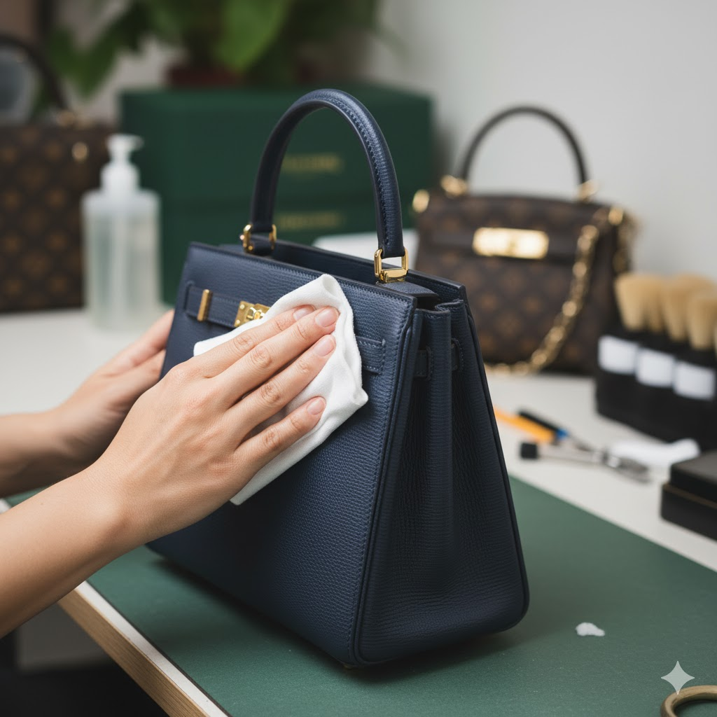 接下來,使用稀釋的清潔劑擦拭表面和內層。由於不同的物料需要使用不同的刷子以免損壞,因此要特別留意。皮革部分一般使用軟刷和濕布清潔。